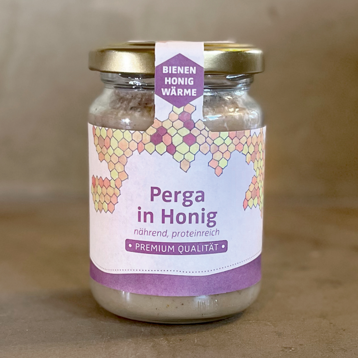 Diesen Honig haben wir mit 8% frischem Perga aus eigener Imkerei angereichert.